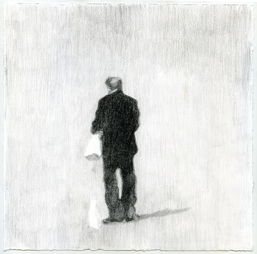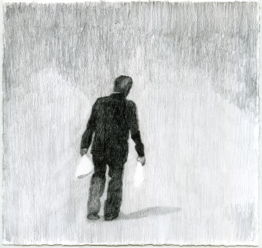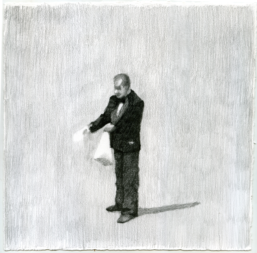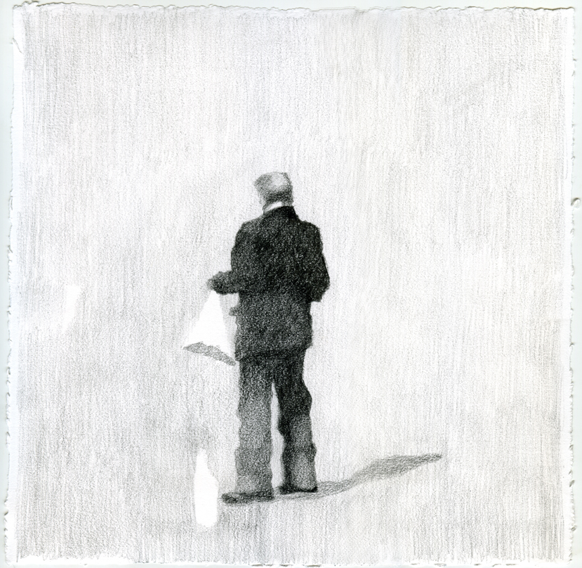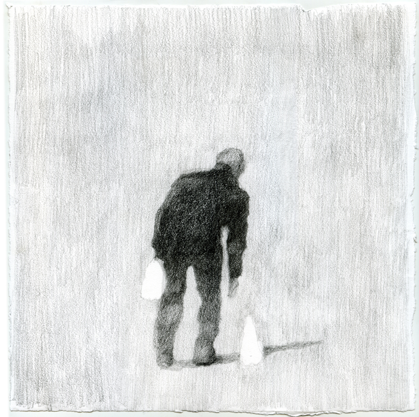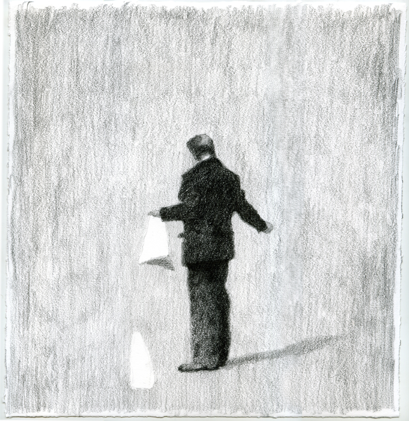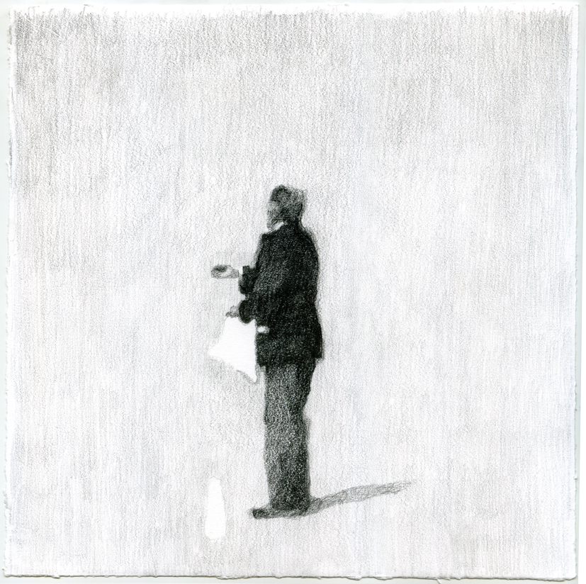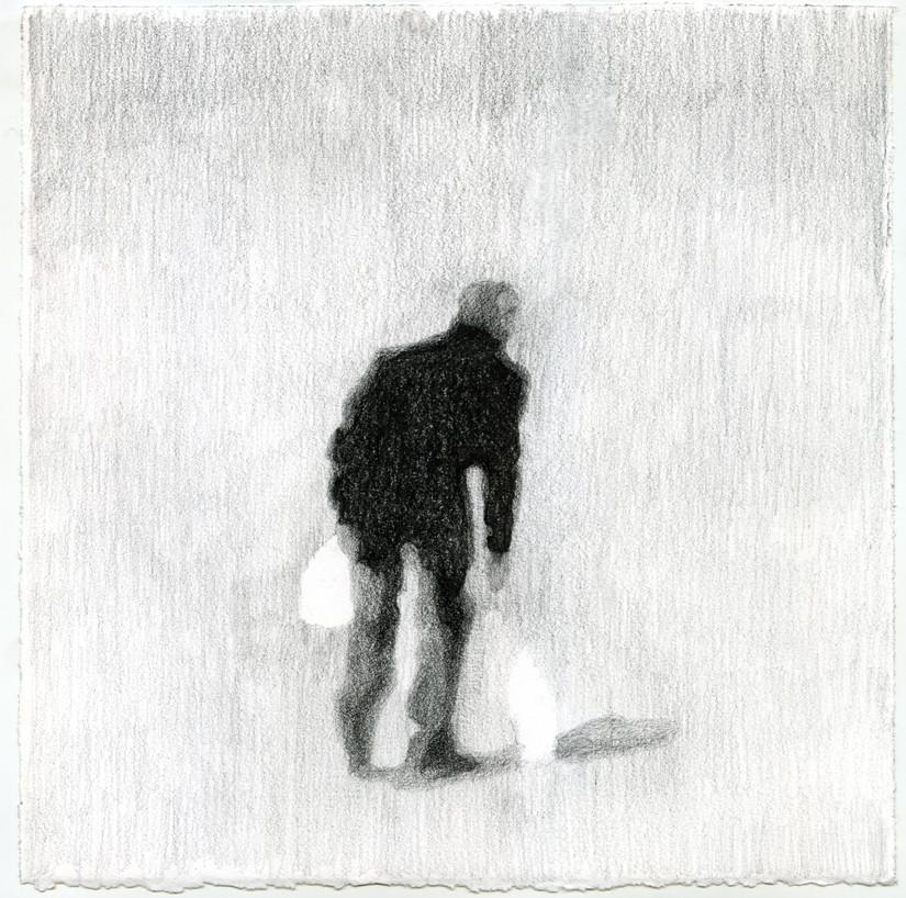 The series In Memoriam, Life goes on, is a group of 28, 11×11 inches, pencil on paper drawings made to be displayed in a grid. They are based on footage of local news covering the event live that day. These works resembling a storyboard, illustrate the simple action of feeding pigeons. The drawings render a man in an empty space, eliminating additional details, distancing us yet further from the idea of the objective truth, they can offer us no more than a fragment of reality recalling a faded memory, focusing the attention on the person’s action.