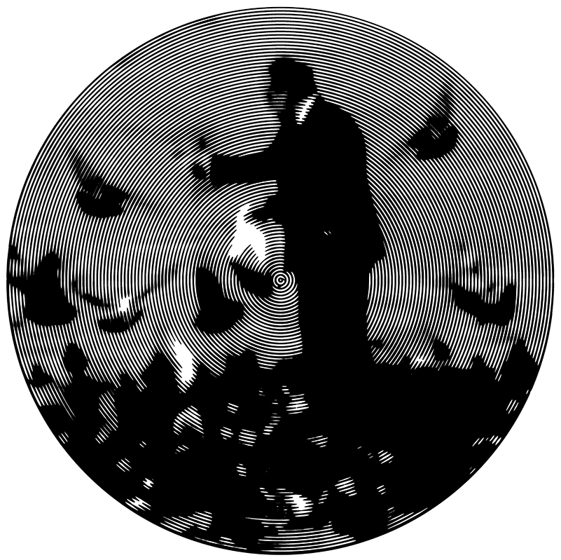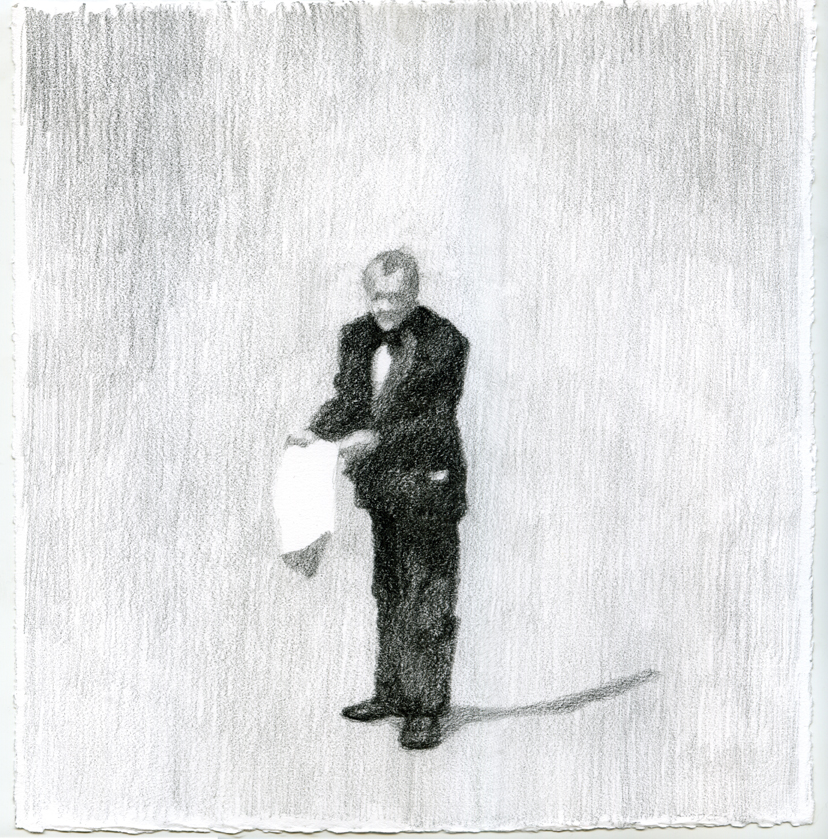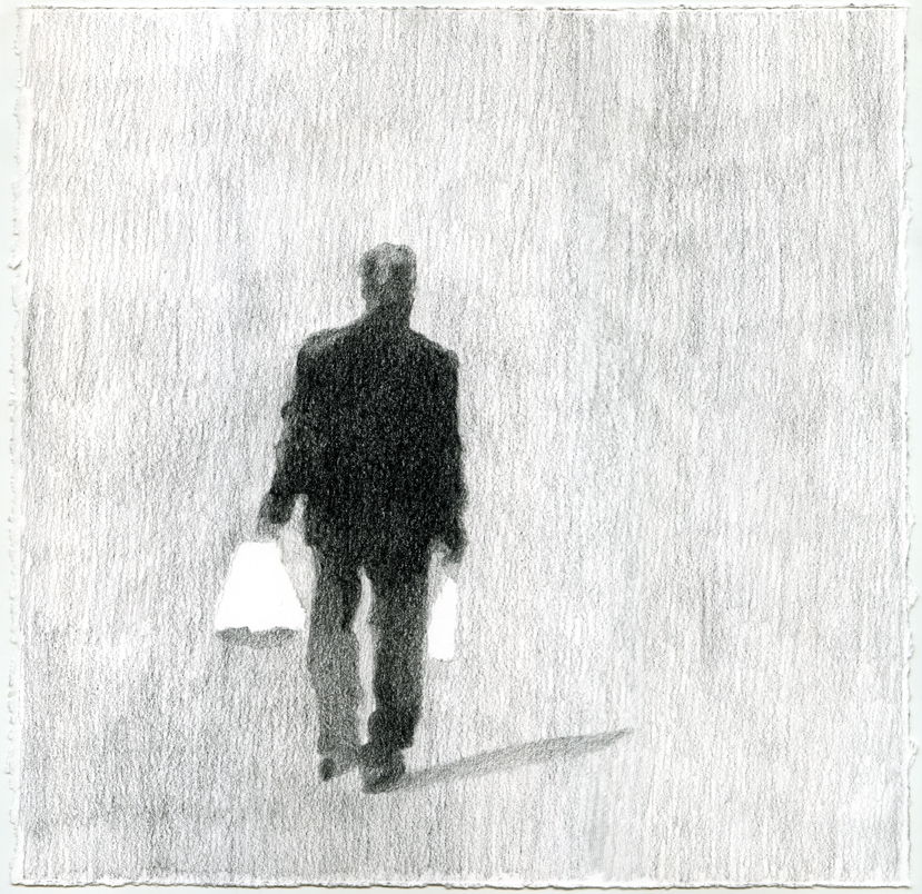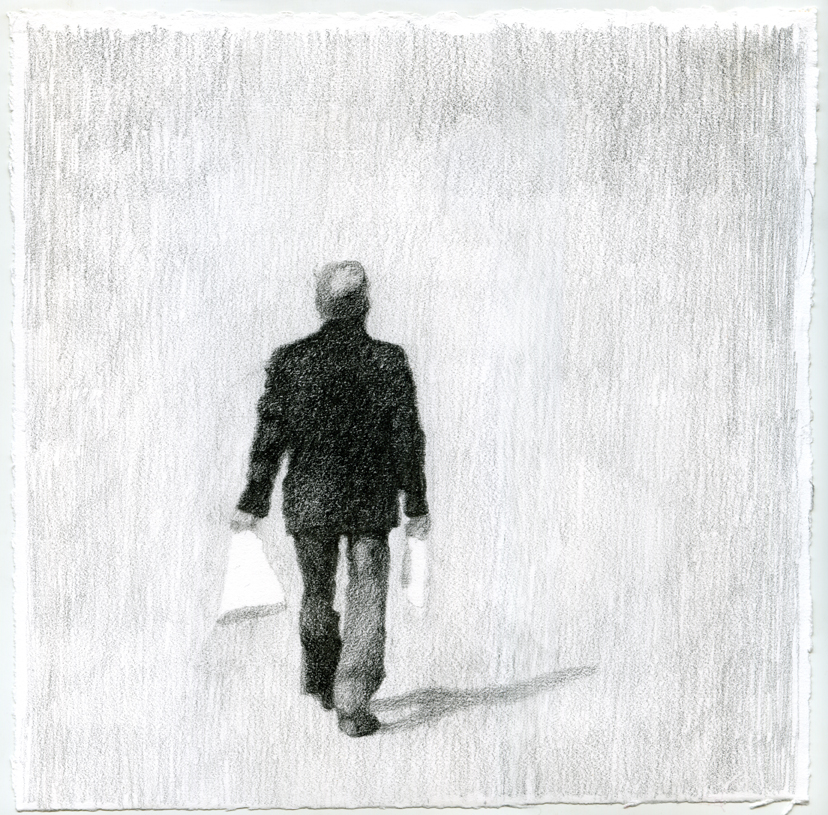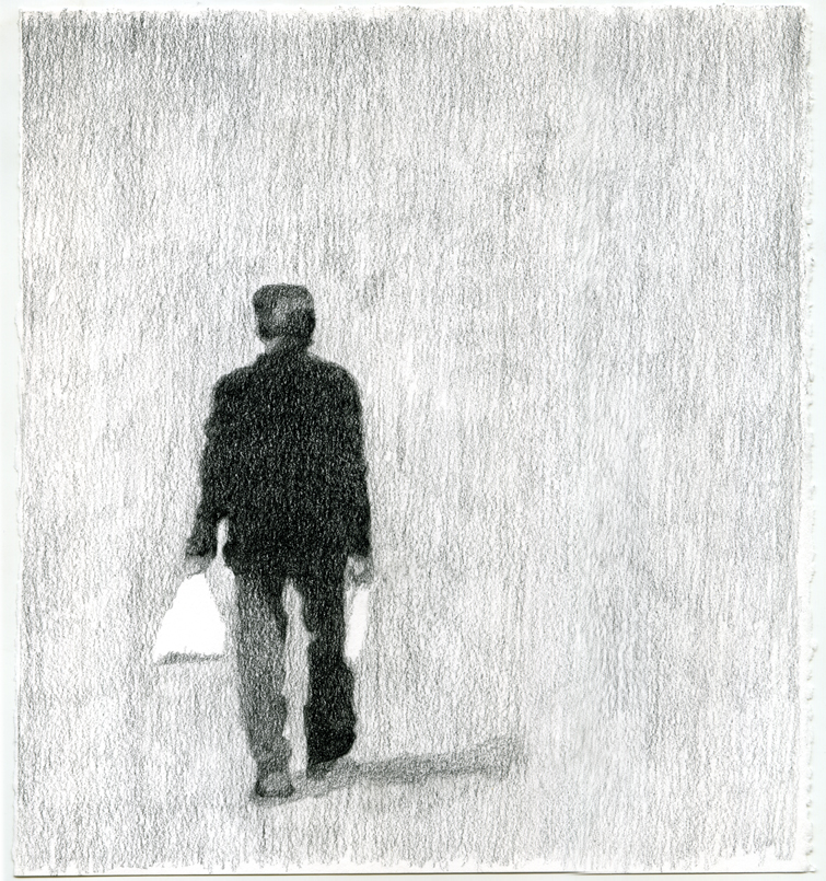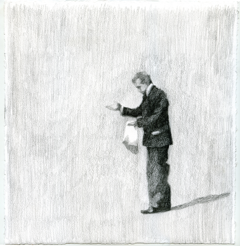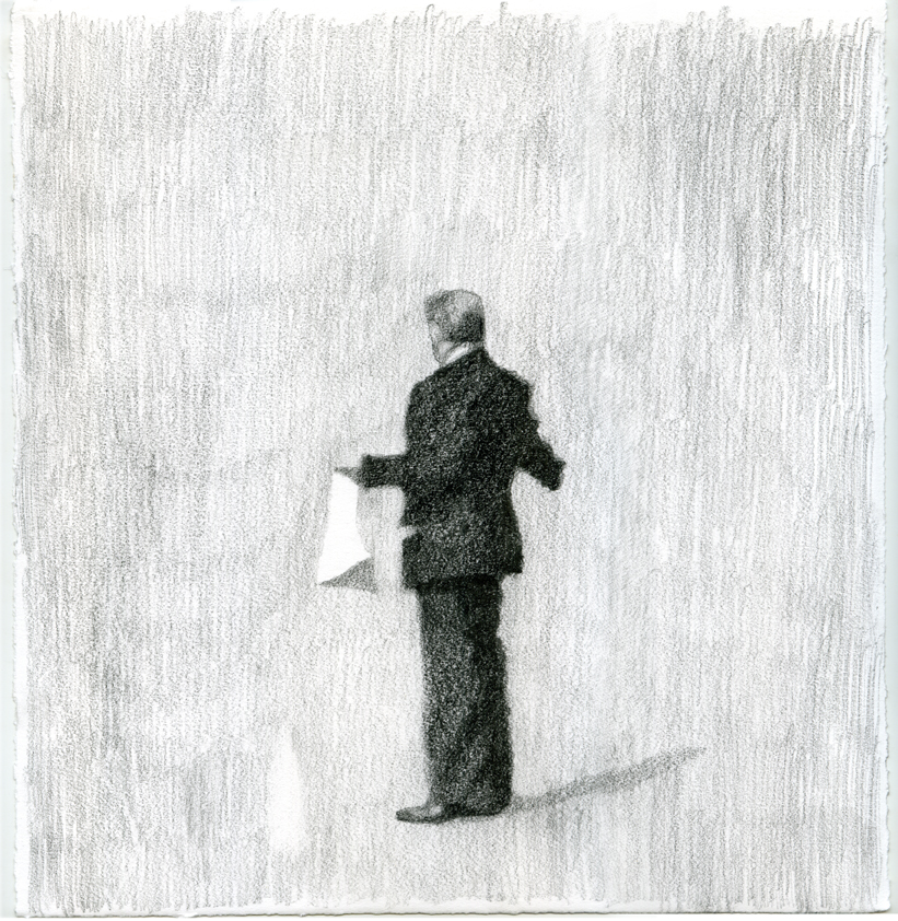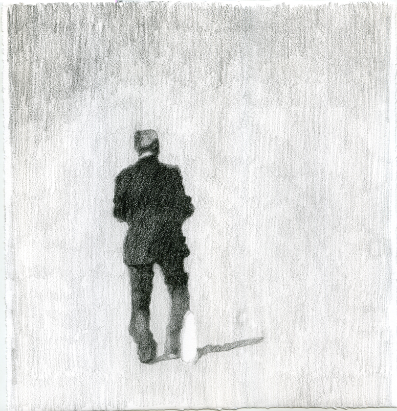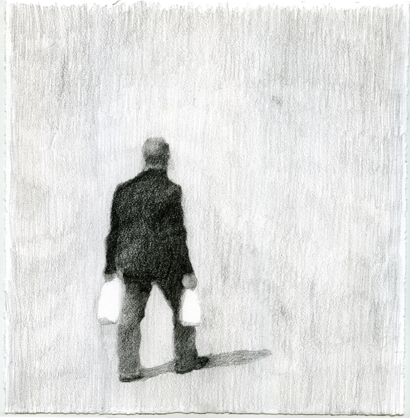 The series In Memoriam, Life goes on, is a group of 28, 11×11 inches, pencil on paper drawings made to be displayed in a grid. They are based on footage of local news covering the event live that day. These works resembling a storyboard, illustrate the simple action of feeding pigeons. The drawings render a man in an empty space, eliminating additional details, distancing us yet further from the idea of the objective truth, they can offer us no more than a fragment of reality recalling a faded memory, focusing the attention on the person’s action.