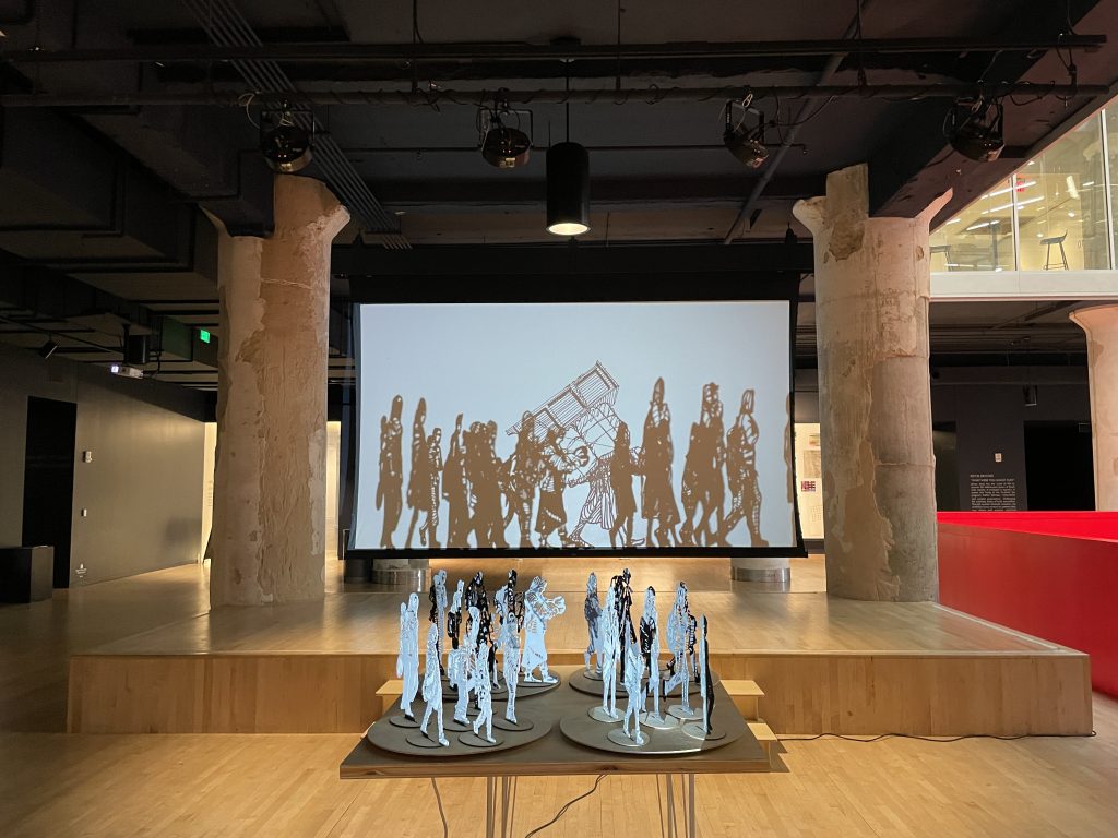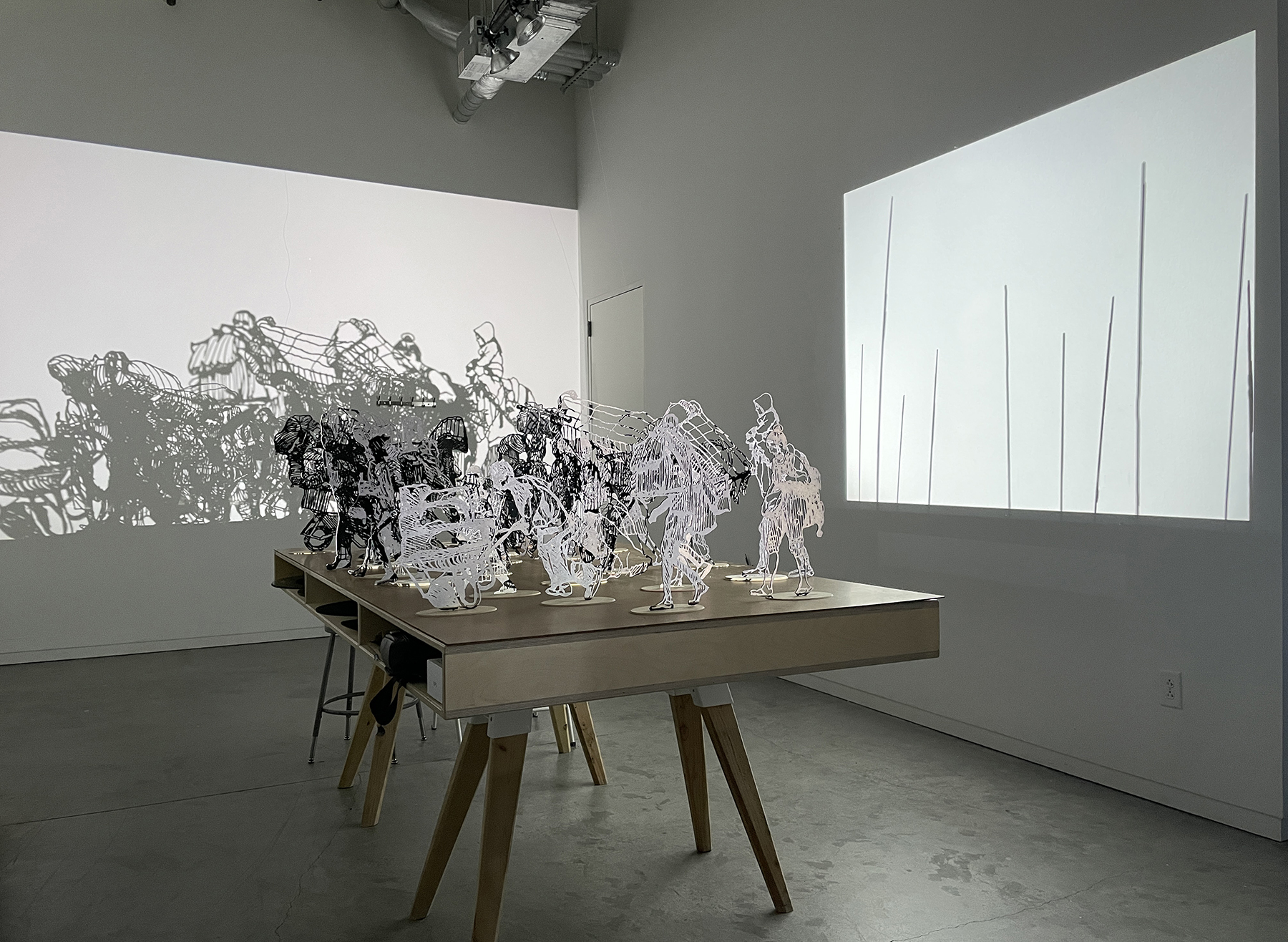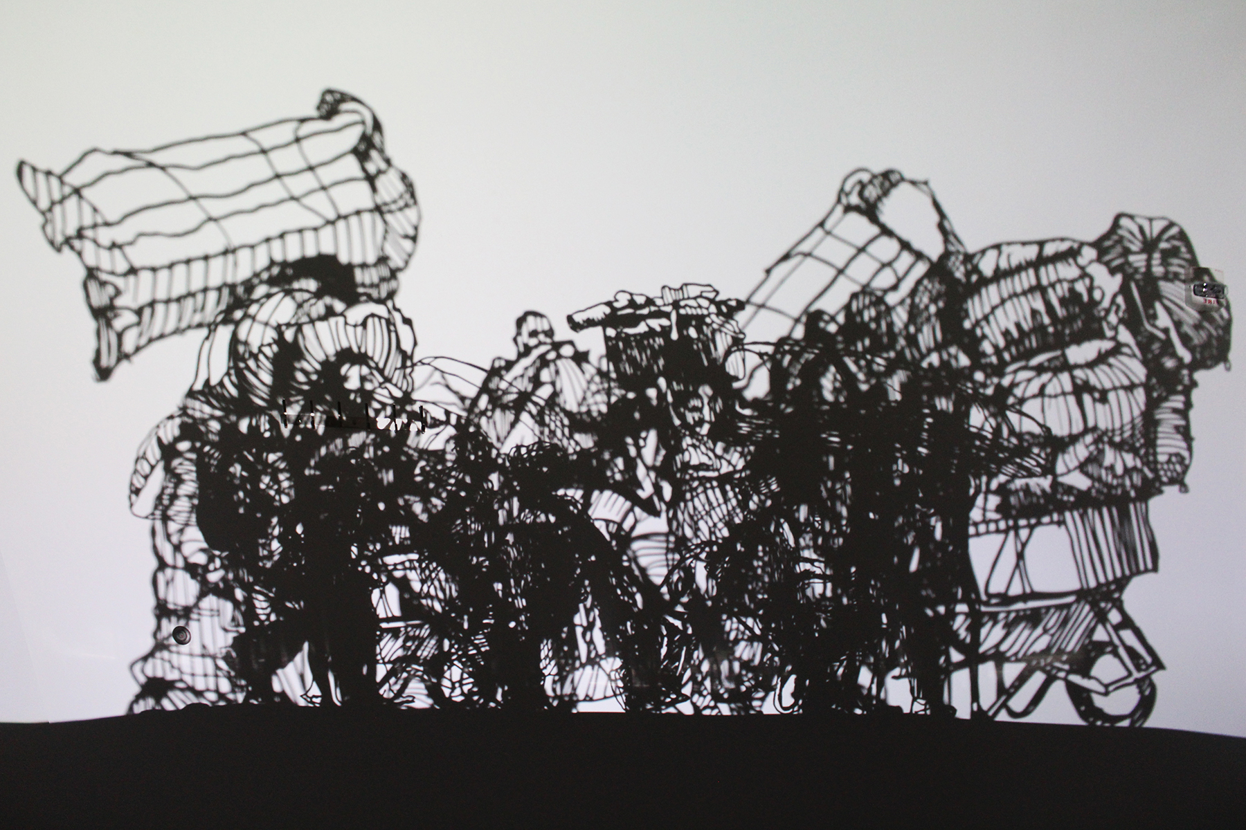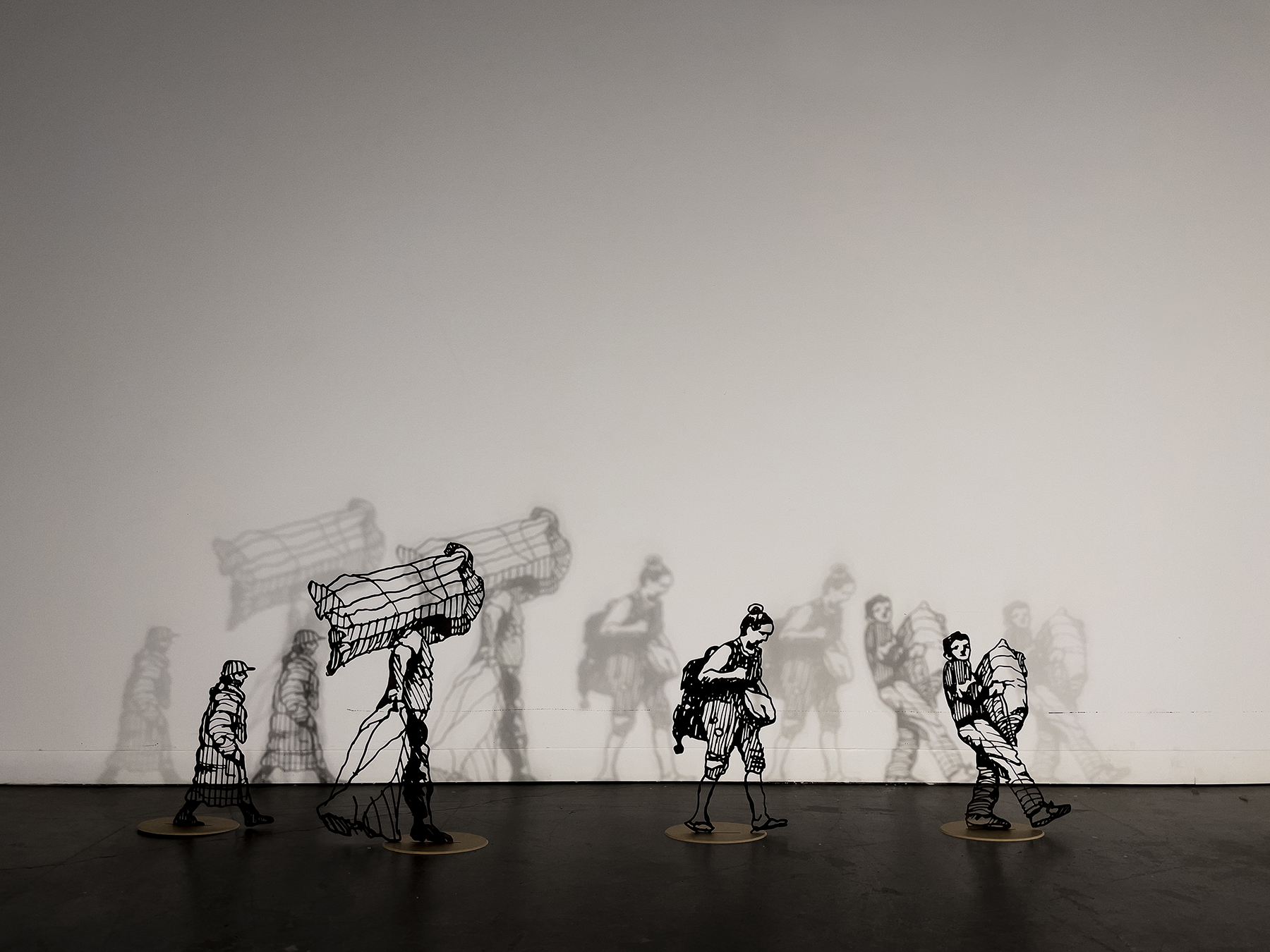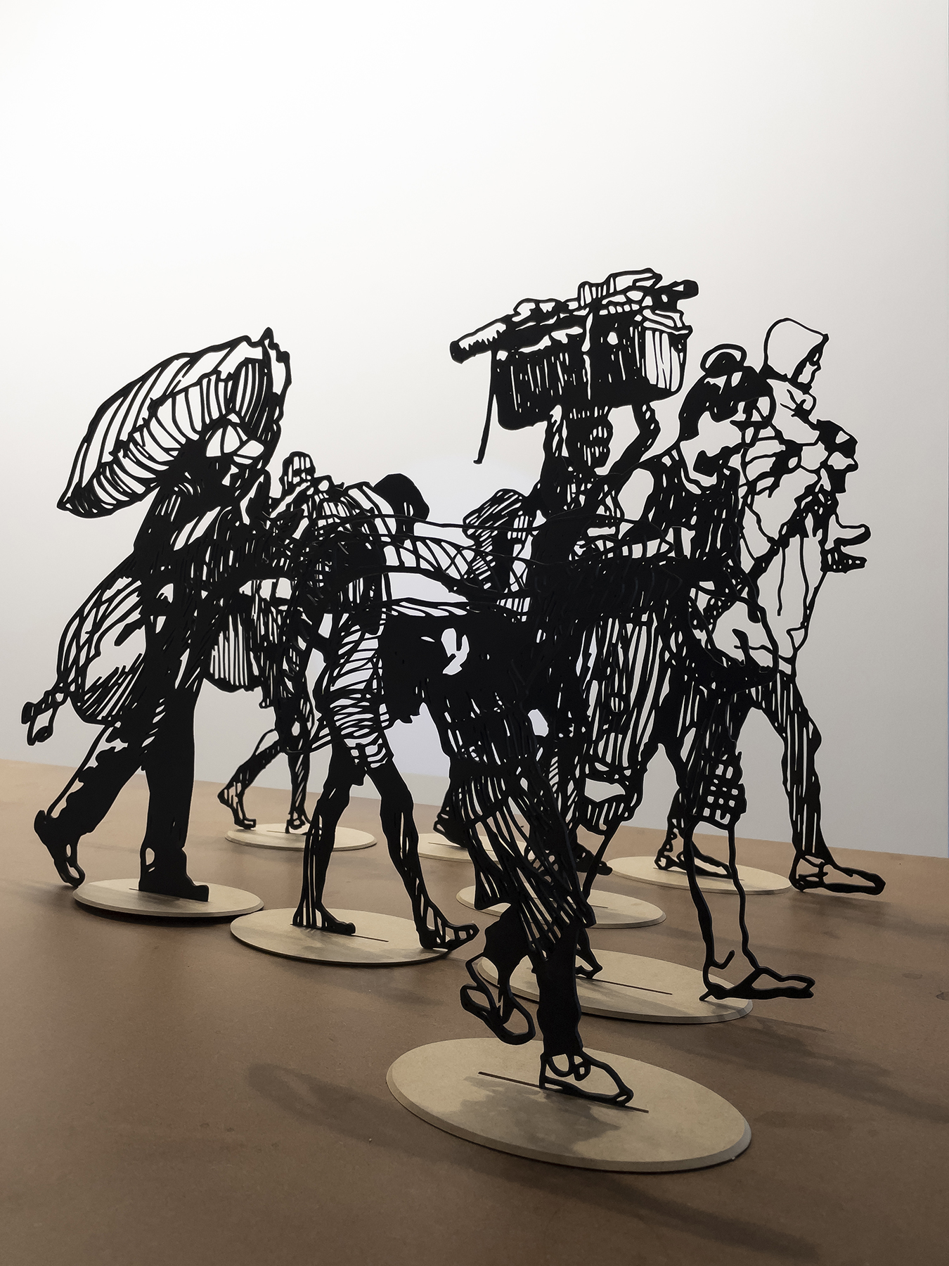 Using formal elements of drawing, the 3D works depict walking individuals, which with lights, cast overlapping shadows that create masses of unrecognizable crowds, presenting a flexible, alternative world that can be modified, drawn and redrawn.