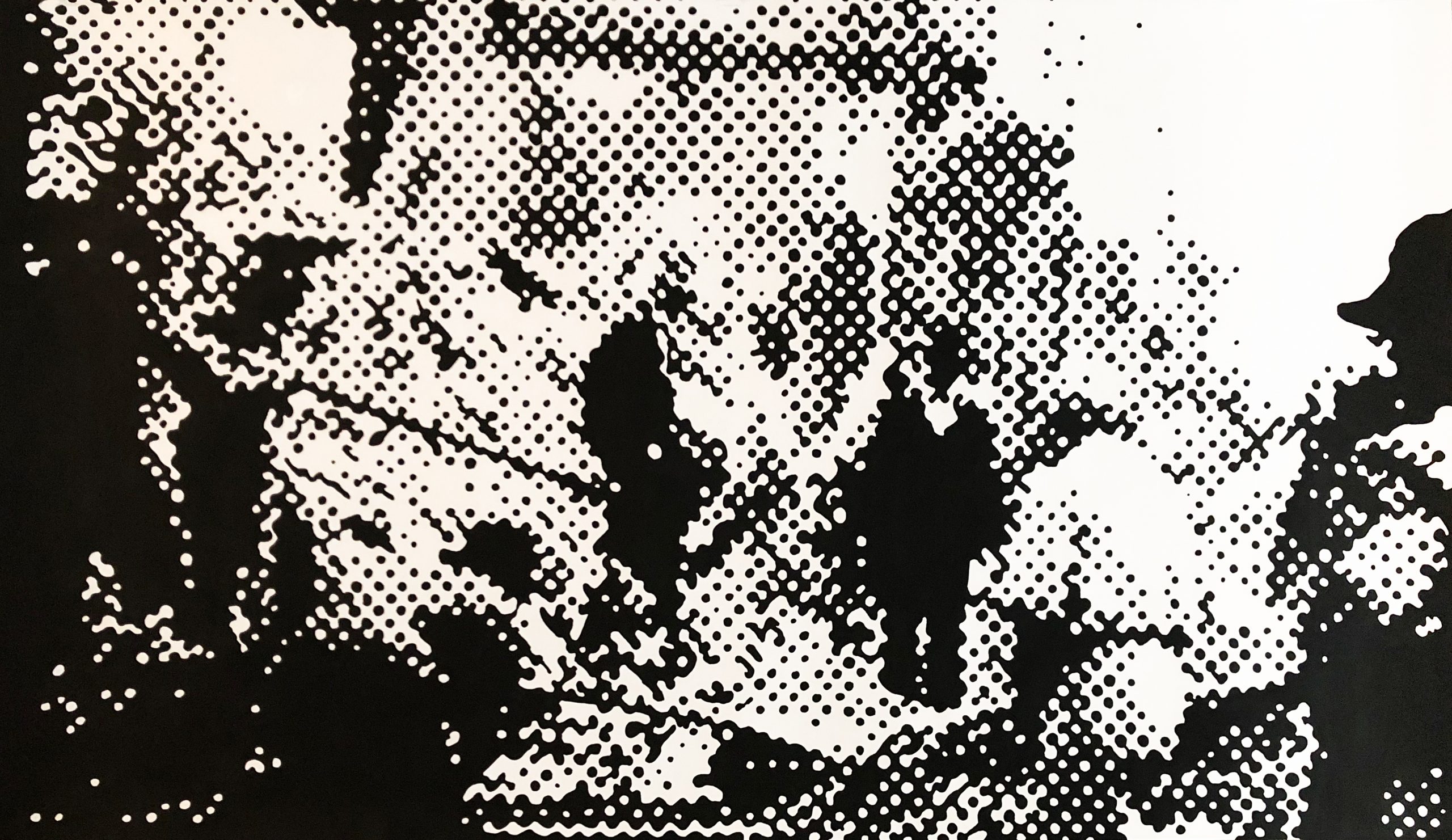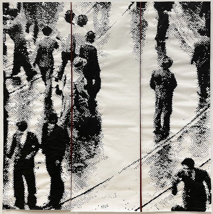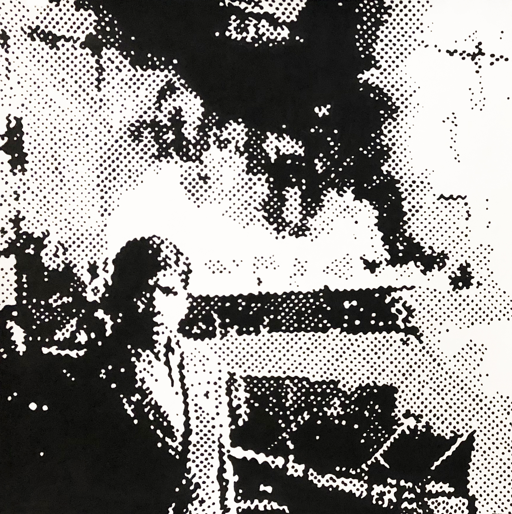Created from archival photographs of historical events from the 1940s and 1950s, these works are made with acrylic on different types of papers, using the halftone technique that simulates continuous-tone imagery through the use of dots, varying in size and spacing, thus generating a gradient-like effect. The result, is an abstract image at a close look that becomes clearer and takes form as the viewer gets farther from it. This works a metaphor of watching the current situation of my own country from outside.