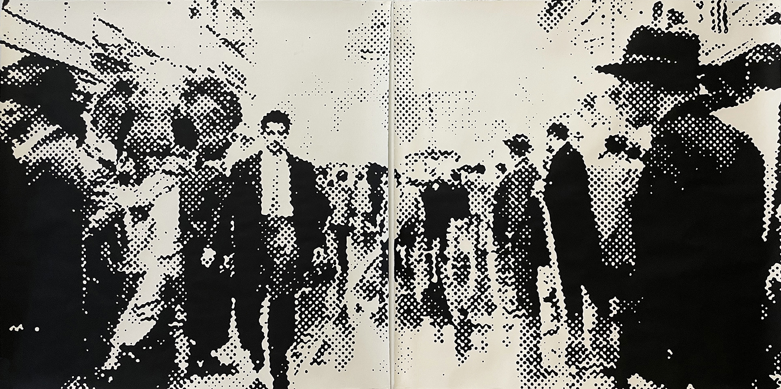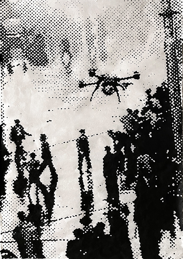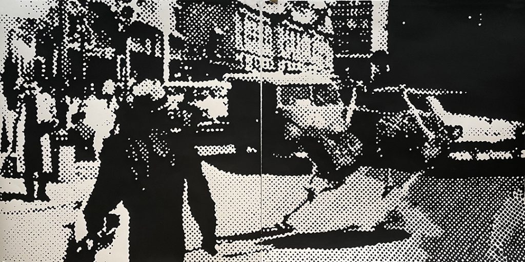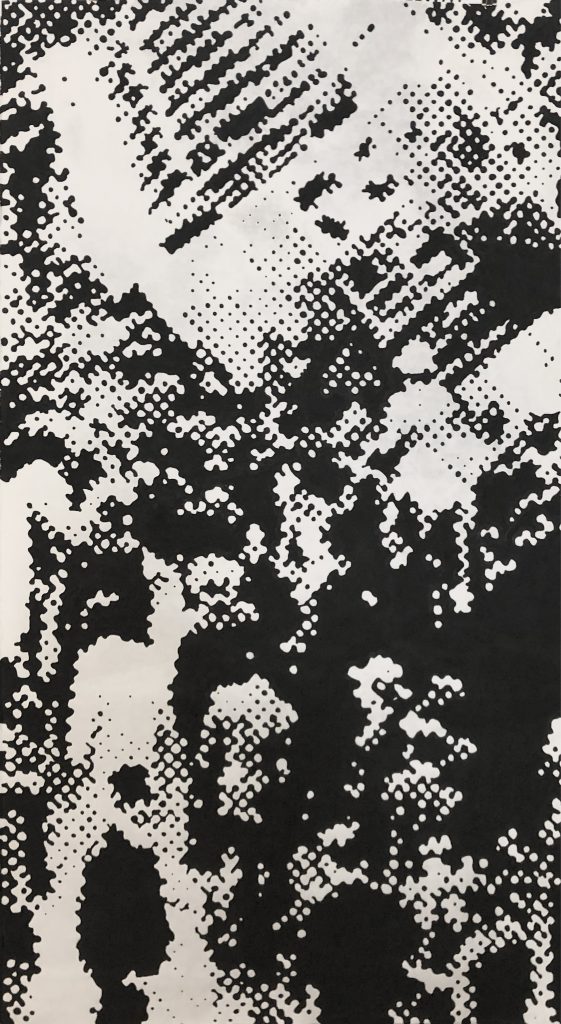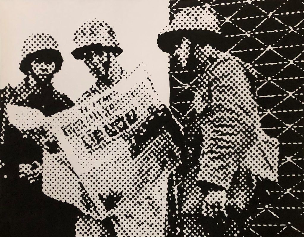 Created from archival photographs of historical events from the 1940s and 1950s, these works are made with acrylic on different types of papers, using the halftone technique that simulates continuous-tone imagery through the use of dots, varying in size and spacing, thus generating a gradient-like effect. The result, is an abstract image at a close look that becomes clearer and takes form as the viewer gets farther from it. This works a metaphor of watching the current situation of my own country from outside.