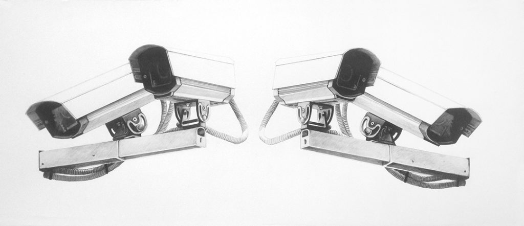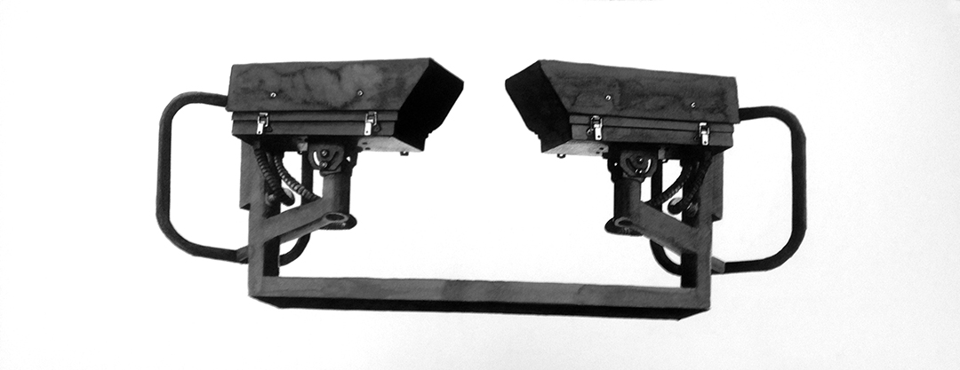 CCTV consists of a small set of ink and pencil drawings related to the widespread increment of surveillance intended to record human behavior in contemporary societies where more CCTV cameras, magnetometers, BioWatch air-sniffers, razor wire, concrete fortifications and all the rest of the machinery of security and surveillance have become so much a part of the furniture of life that we barely notice them.